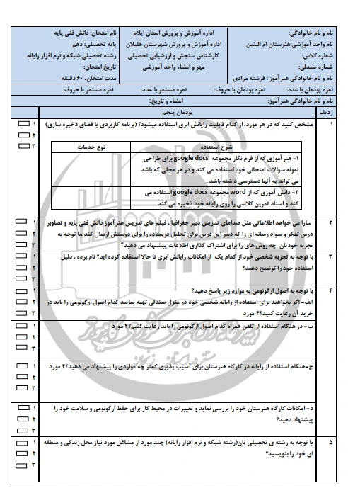 نمونه سوال پودمان پنجم کتاب دانش فنی پایه(دهم)